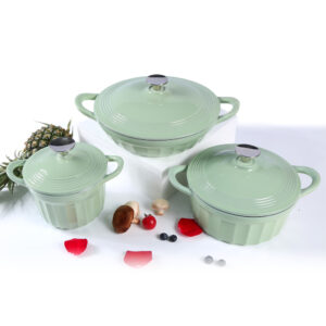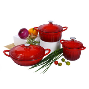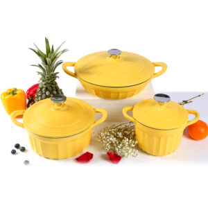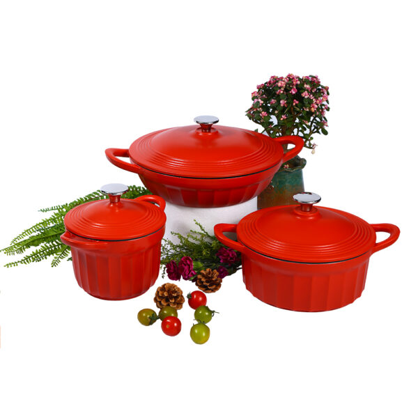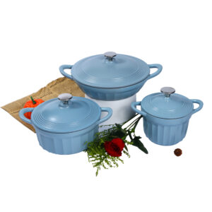 Elevate your cooking experience with this 3-piece enameled cast iron cookware set, combining timeless style with superior performance.