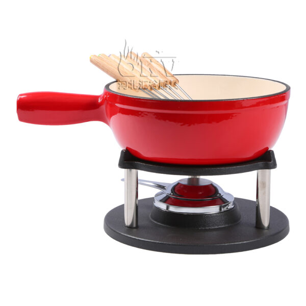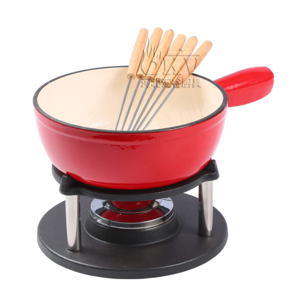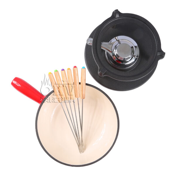 Crafted from heavy-duty cast iron and finished with a glossy enamel coating, this fondue pot retains heat beautifully for silky-smooth melted cheese, decadent chocolate, or even broth-based hot pot. The integrated alcohol burner keeps contents warm at the perfect temperature, while the 6 wooden-handle forks make it easy to dip and share with friends.